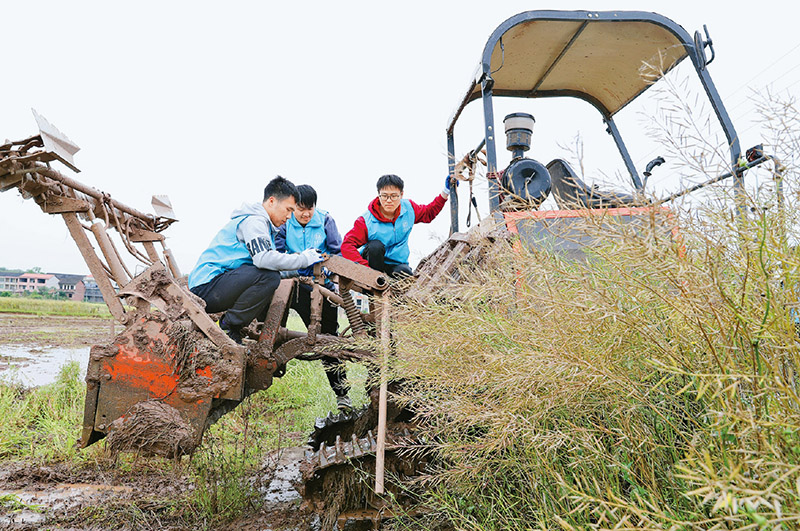 圖為2023年4月29日,南華大學的大學生志愿者利用五一假期到湖南省衡陽市衡陽縣西渡鎮(zhèn)新橋村開展勞動助農(nóng)行動,幫助農(nóng)民檢修、保養(yǎng)農(nóng)機,用勞動實踐助力鄉(xiāng)村振興。(新華社發(fā) 曹正平/攝)