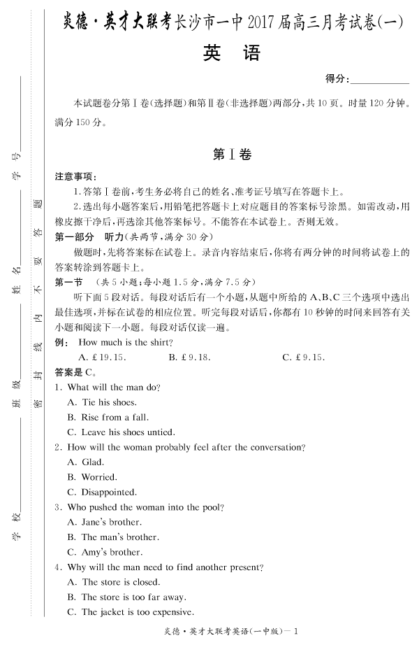 【英語】炎德英才大聯(lián)考2017長沙一中高三1次月考