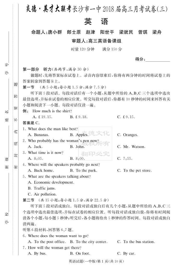 【英語(yǔ)】炎德英才大聯(lián)考2018長(zhǎng)沙一中高三3次月考