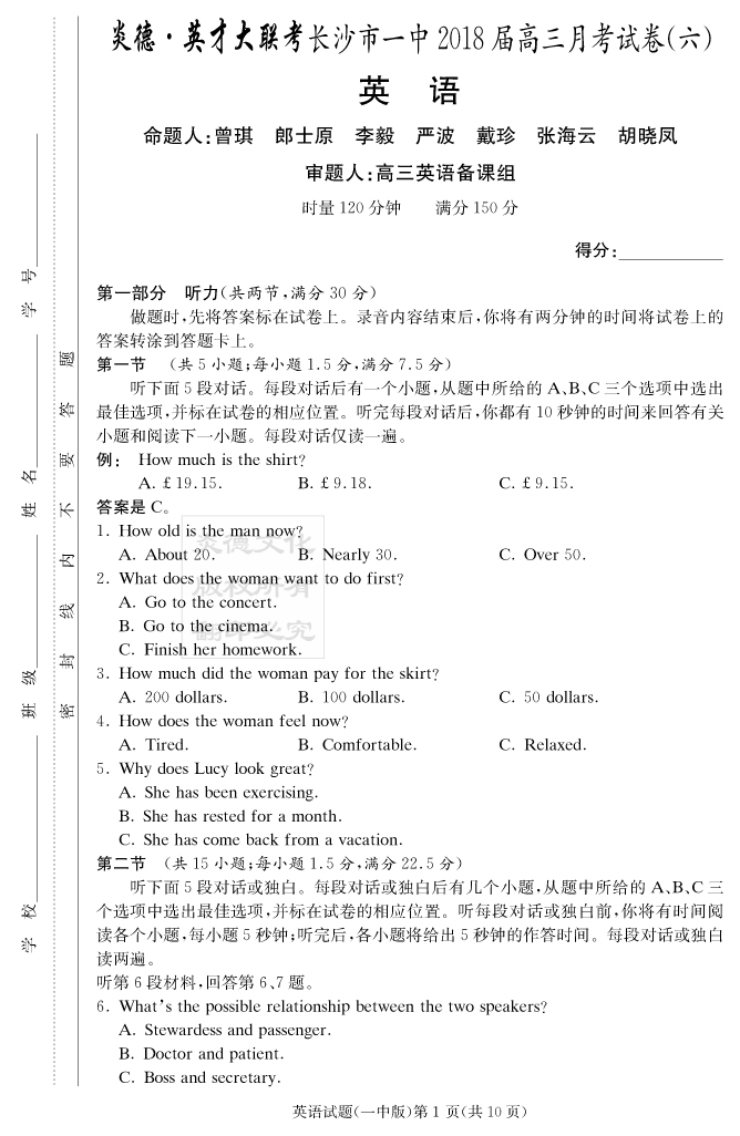 【英語】炎德英才大聯(lián)考2018長(zhǎng)沙一中高三6次月考