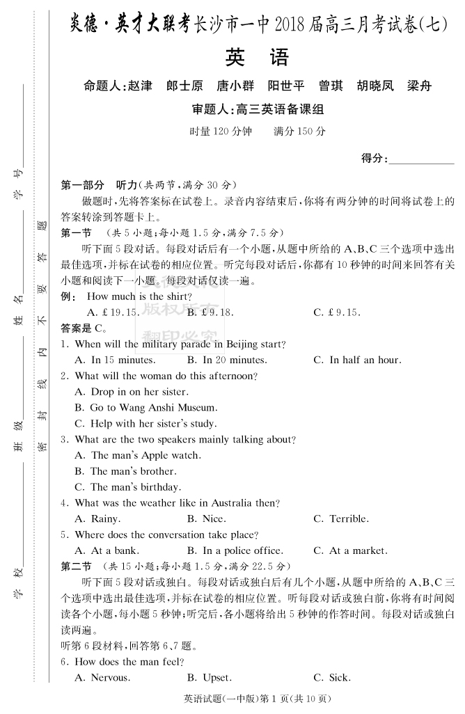 【英語】炎德英才大聯(lián)考2018長沙一中高三7次月考