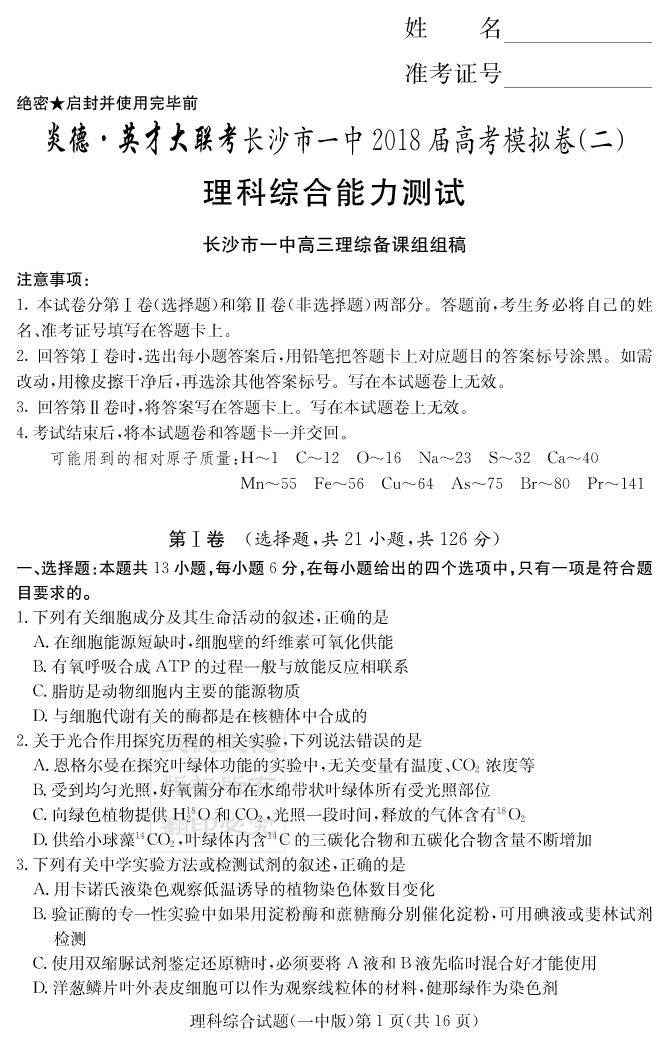 【理綜】炎德英才大聯(lián)考2018長沙一中高三11次月考(模擬二)